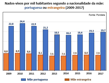 5. Além disso, importa igualmente não subestimar a diferença entre as taxas de natalidade registadas no universo dos residentes estrangeiros e no universo dos residentes nacionais, situada em mais de dez pontos percentuais (ou seja, com um valor próximo dos 20 mil nados-vivos com mãe estrangeira por cada mil estrangeiros e de apenas 8 por mil no caso de mães portuguesas). Aliás, não só essa diferença é expressiva como tem vindo a acentuar-se nos últimos anos, dada a estagnação da taxa de natalidade no universo da população residente nacional.