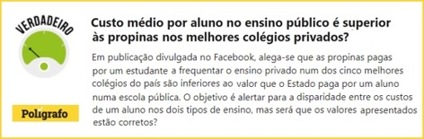 4. Apesar de tudo isto, e das diferenças de natureza qualitativa que desaconselham comparações nestes termos (sim, o público e o privado funcionam a partir de princípios e objetivos distintos), o Polígrafo nem pestanejou (ver aqui e aqui), validando a tese, colada com cuspo, de que o custo de um aluno no ensino privado é inferior ao custo de um aluno no ensino público. Isto é, limitando-se a fazer eco da aldrabice iniciada pelo Instituto+Liberdade (diz-que-são-factos) de Carlos Guimarães Pinto, que deitou o barro à parede a ver se pegava. E pegou.